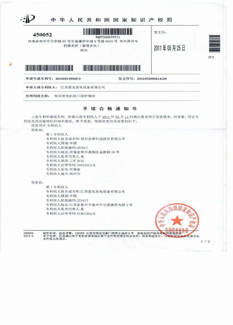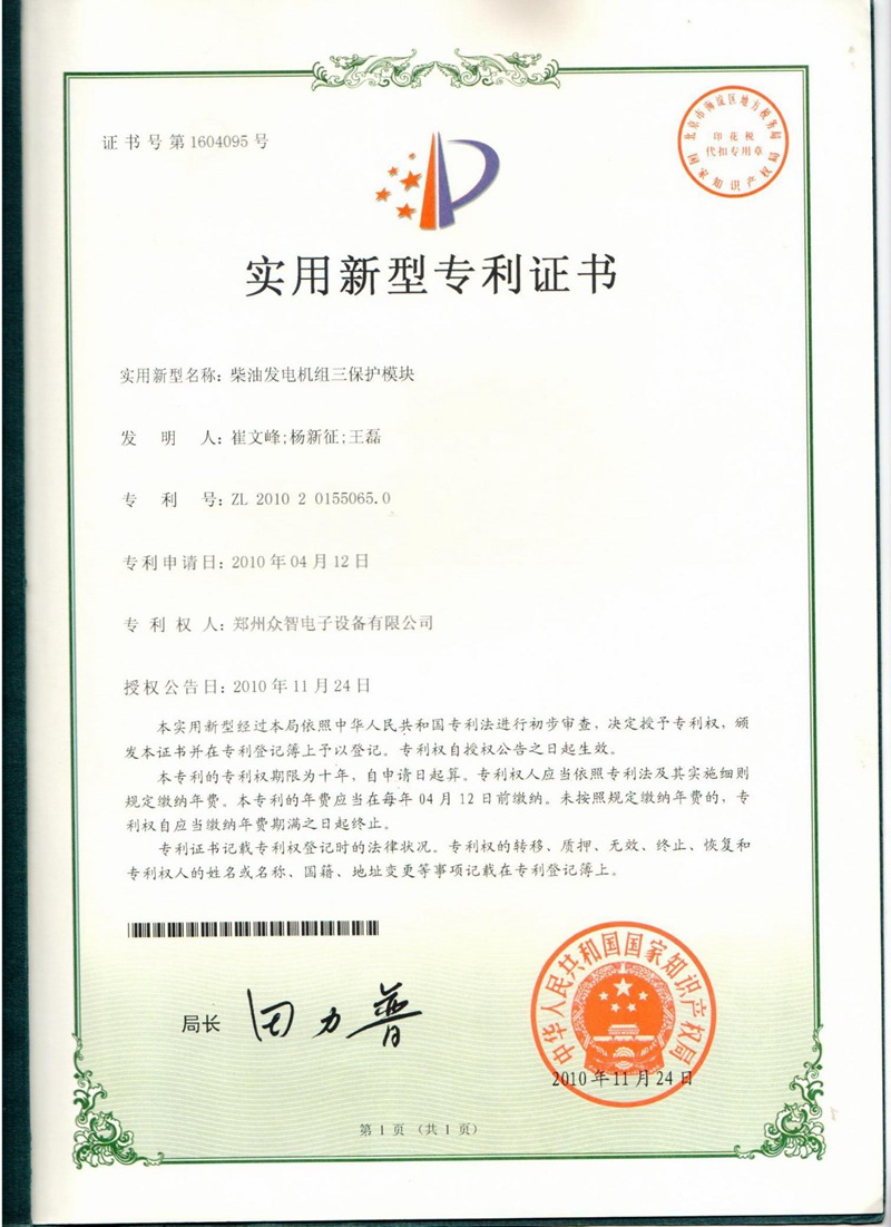 柴油發(fā)電機組三保護(hù)模塊-專利證書